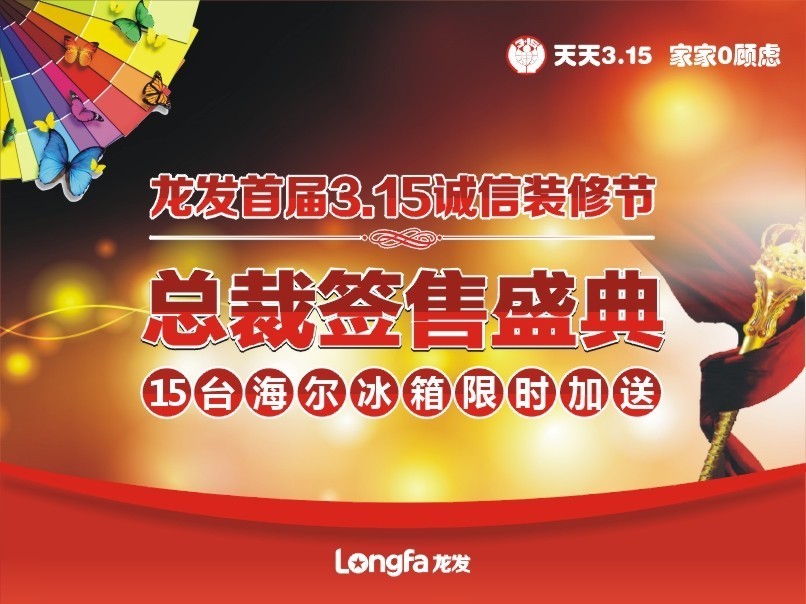 龙发装饰首届3.15诚信装修节&总裁签售盛典即将盛大开启,届时15台海尔冰箱限时加送!请记住,这是在您享受了定金礼、设计礼、签单礼后额外加送的,四重豪礼+三大特权=完美新家。此外还有龙发独有的【工程不达标全额退款,环保不达标全额退款】给您上个双保险!现场更有“微信抢红包”,数量不限,多抢多得,好运传递一整年!3月14日,龙发等您来!